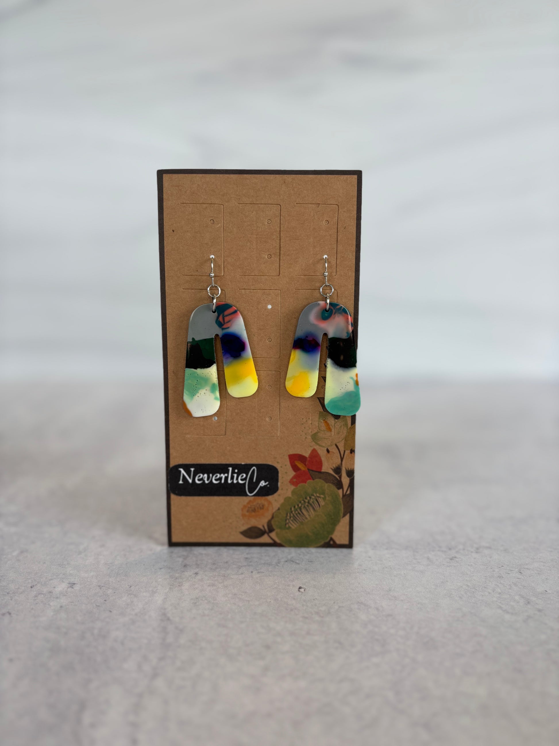 Each pair of Neverlie Co. earrings is one-of-a-kind, crafted from colorful PLA plastic scraps saved from the landfill and melted into bold, modern shapes using silicone molds. Lightweight, vibrant, and eco-conscious, these earrings turn 3D printer waste into wearable art with a story.