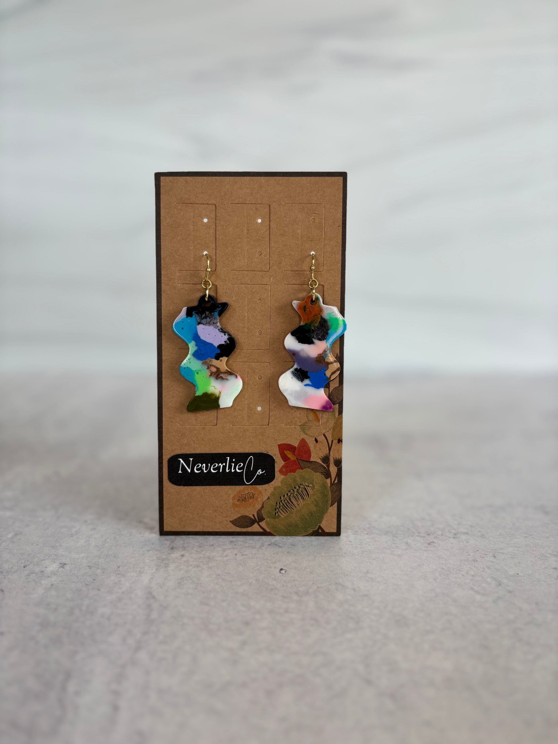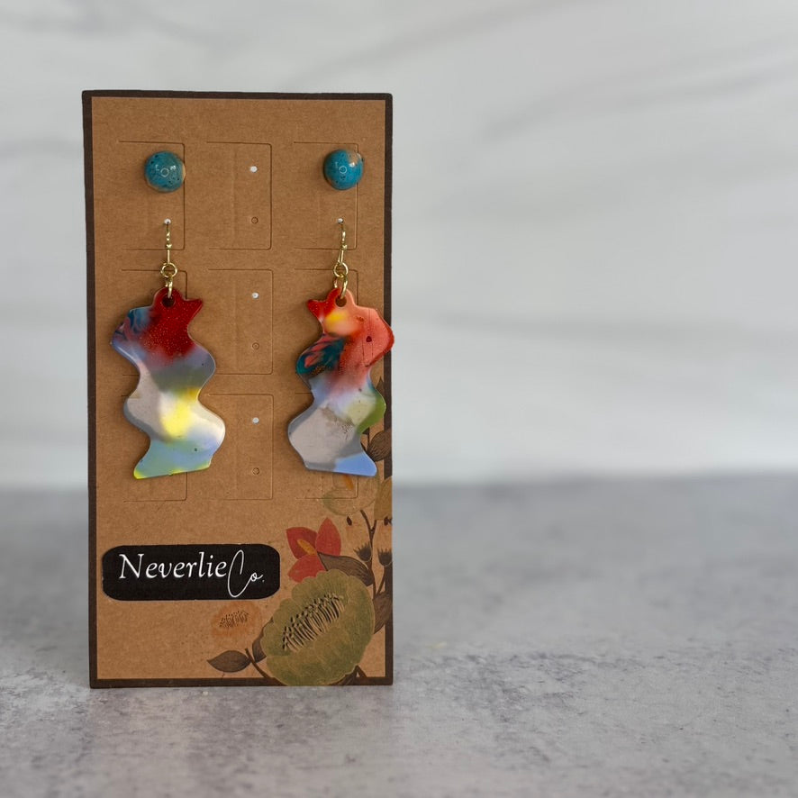 Each pair of Neverlie Co. earrings is one-of-a-kind, crafted from colorful PLA plastic scraps saved from the landfill and melted into bold, modern shapes using silicone molds. Lightweight, vibrant, and eco-conscious, these earrings turn 3D printer waste into wearable art with a story.